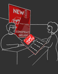 Dave checks in Flight VS 810 from London to New York. He is invited to join Virgin’s exclusive inflight conspiracy game. A Virgin 'passport' contains his boarding card with seat number, game instructions, and swipe card ID. At this point, his seat number is registered as his identity in the game, supporting private interactions in the game itself. The passport is meant to be collectible and the card reusable for future trips, encouraging a Virgin gaming 'cult'. |